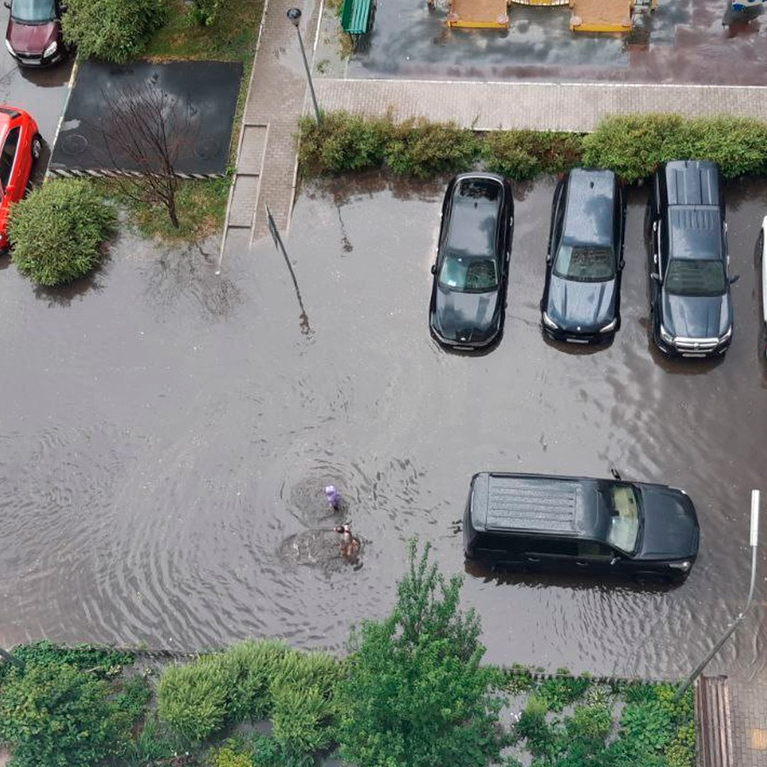 Стихия не пощадила и жителей подмосковного Краснознаменска: там град выбил стёкла в машинах, улицы затоплены.