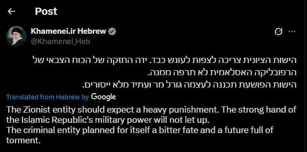 "Рука военной силы Исламской Республики не ослабнет. Преступная организация запланировала себе горькую судьбу и будущее, полное мучений", - написал Хаменеи на иврите на своей странице в Х.