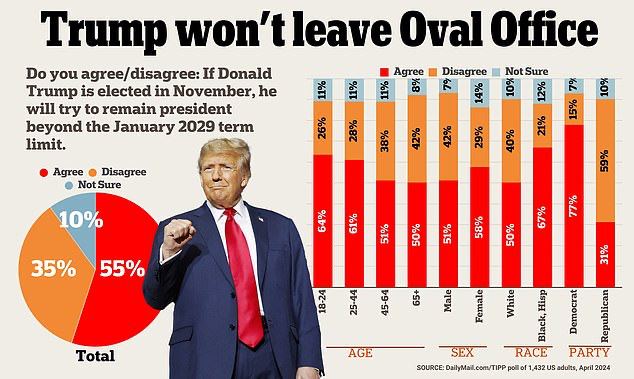 Истерика демократов вокруг перспективы победы Трампа возымела определённый эффект. В последних опросах сразу 55% американцев полагают, что Трамп в случае возвращения в Белый дом попытается продлить свои президентские полномочия после 4 лет на посту главы государства.