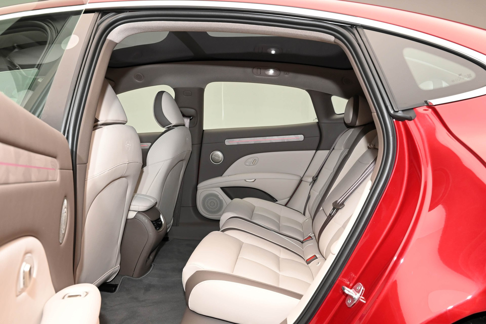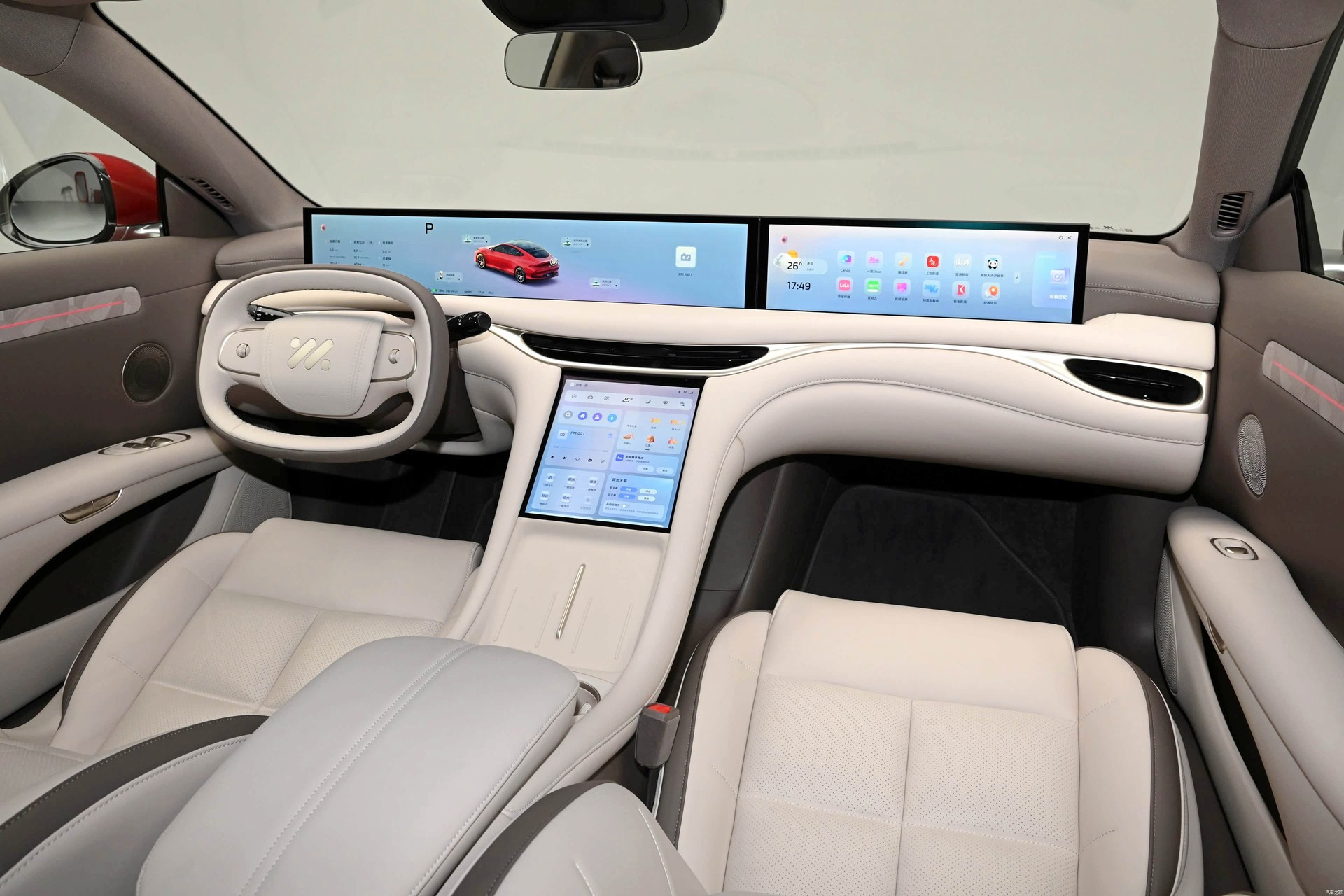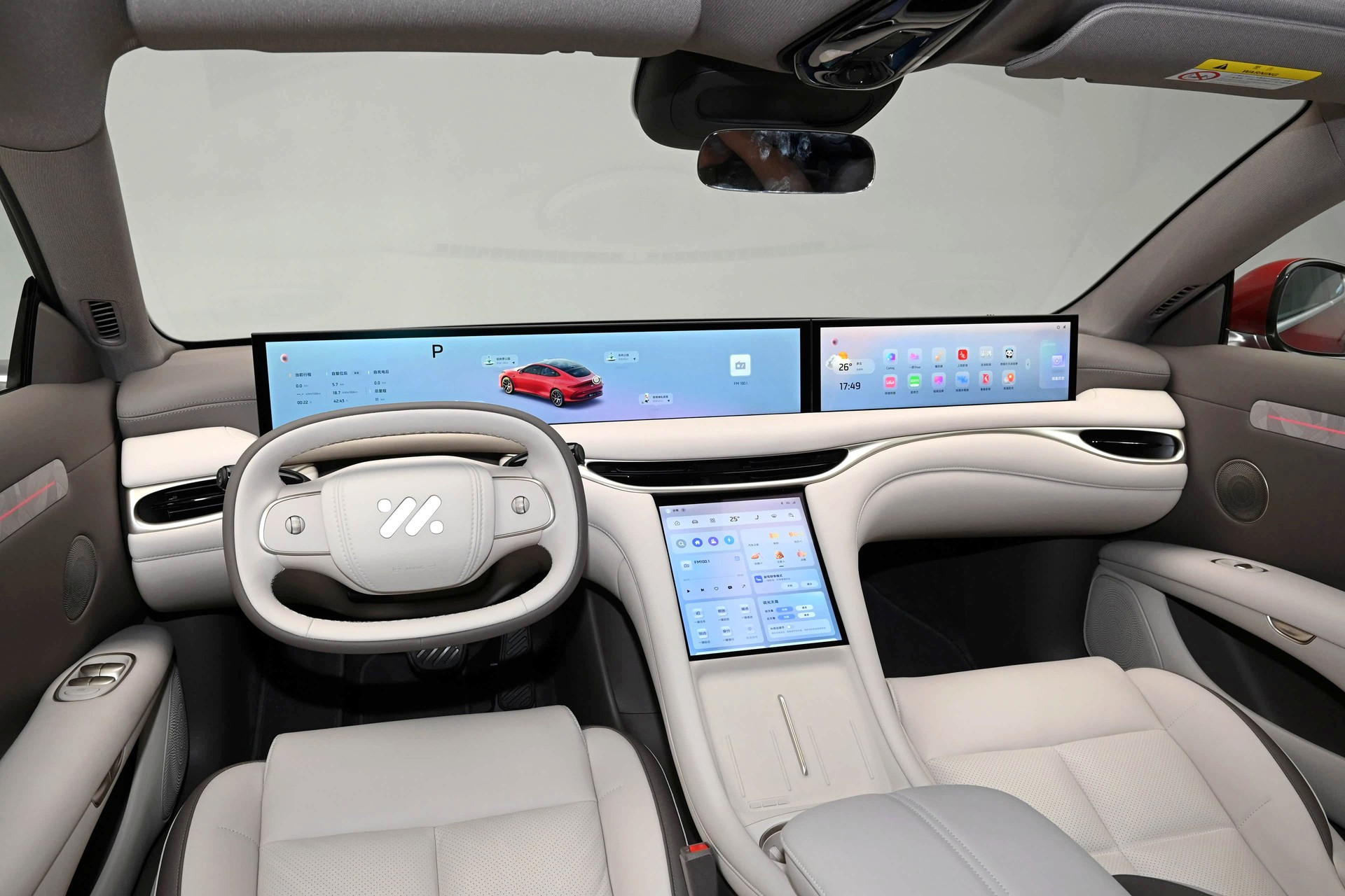 Главное новшество в салоне — более-менее традиционный овальный руль вместо прежнего усечённого штурвала без верхней части обода, клиенты приняли его прохладно. Дизайн дверных карт стал более лаконичным, пересмотрена палитра отделочных материалов. На передней панели сохранилось гигантское двухэкранное табло и ещё один настроечный «телевизор» под ним, но вся программная оболочка обновлена и напичкана самыми актуальными для китайского рынка приложениями. Панорамная стеклянная крыша может менять степень прозрачности. Штатная аудиосистема насчитывает 21 динамик. Комплект электронных ассистентов водителя очень богатый, в него входит в том числе автопилот второго уровня по классификации SAE. Объём основного багажника — 457 л, со сложенными спинками заднего дивана — 1300 л. Спереди под капотом есть небольшой лоток для хранения зарядного кабеля.
