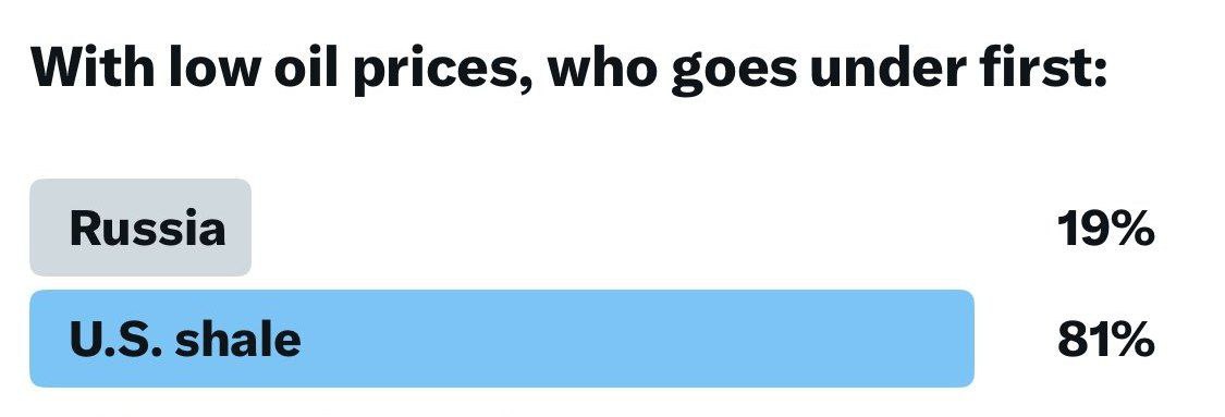 Опрос о том, кто проиграет первым - Россия или американский сланцевый нефтесектор. Рынок акций США этого даже не заметит - вес производителя процессоров NVIDIA в индексе S&P 500 сейчас составляет рекордные 8,2%. Это более чем в три раза превышает энергетический сектор из 25 акций. @banksta