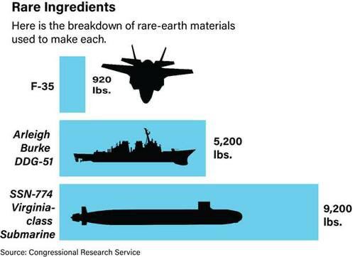 На создание одного F-35 уходит 417 кг редкоземельных металлов, на эсминец - 2,3 тонны, а на подлодку класса Вирджиния - больше 4 тонн. С выпуском вооружений и так большие проблемы - сроки сдвигаются вправо, а тех же F-35 или подлодок произведут сильно меньше плана.