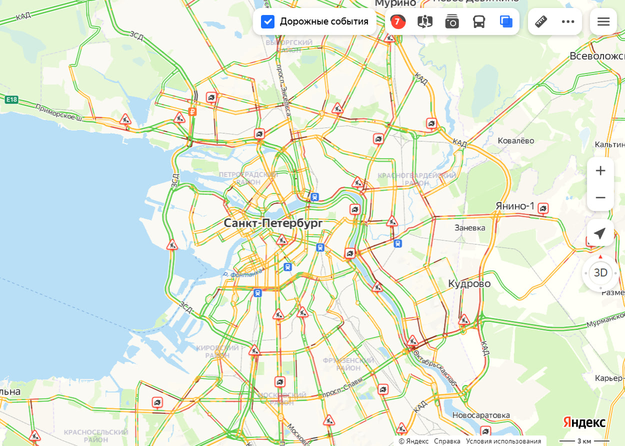 Загруженность дорог Петербурга достигла «красных» 7 баллов к 8:15. Обычно в это время только 5 баллов, а «семёрка» бывает редко и ближе к 9 часам.