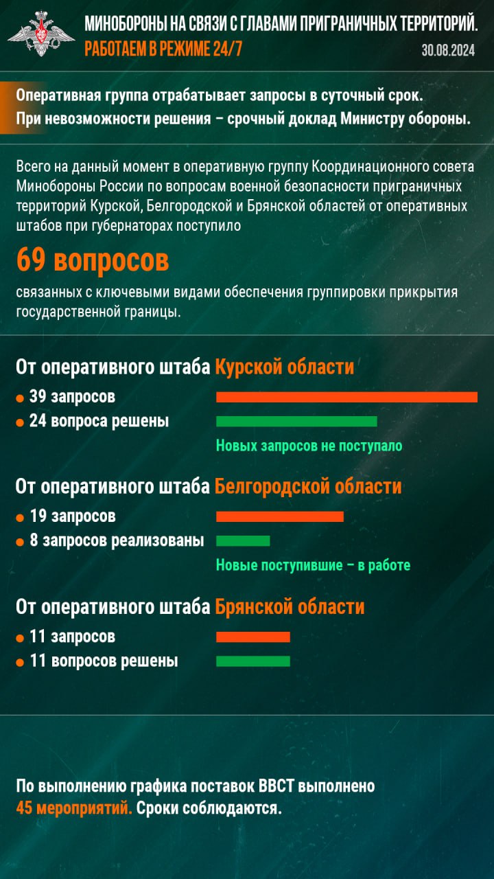 ❗️ Всего на данный момент в оперативную группу Координационного совета Минобороны России по вопросам военной безопасности приграничных территорий Курской, Белгородской и Брянской областей от оперативных штабов при губернаторах поступило 69 вопросов, связанных с ключевыми видами обеспечения группировки прикрытия государственной границы (в том числе, материально-техническое, транспортное, военно-техническое, медицинское, инженерно-строительное).