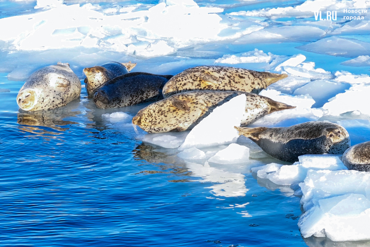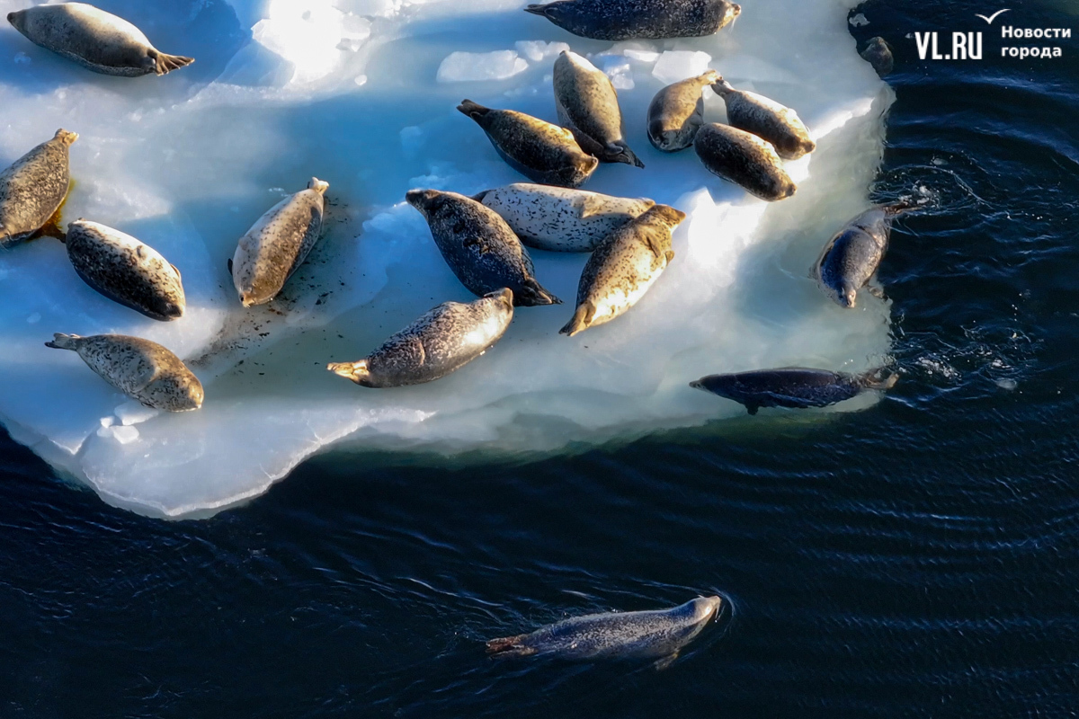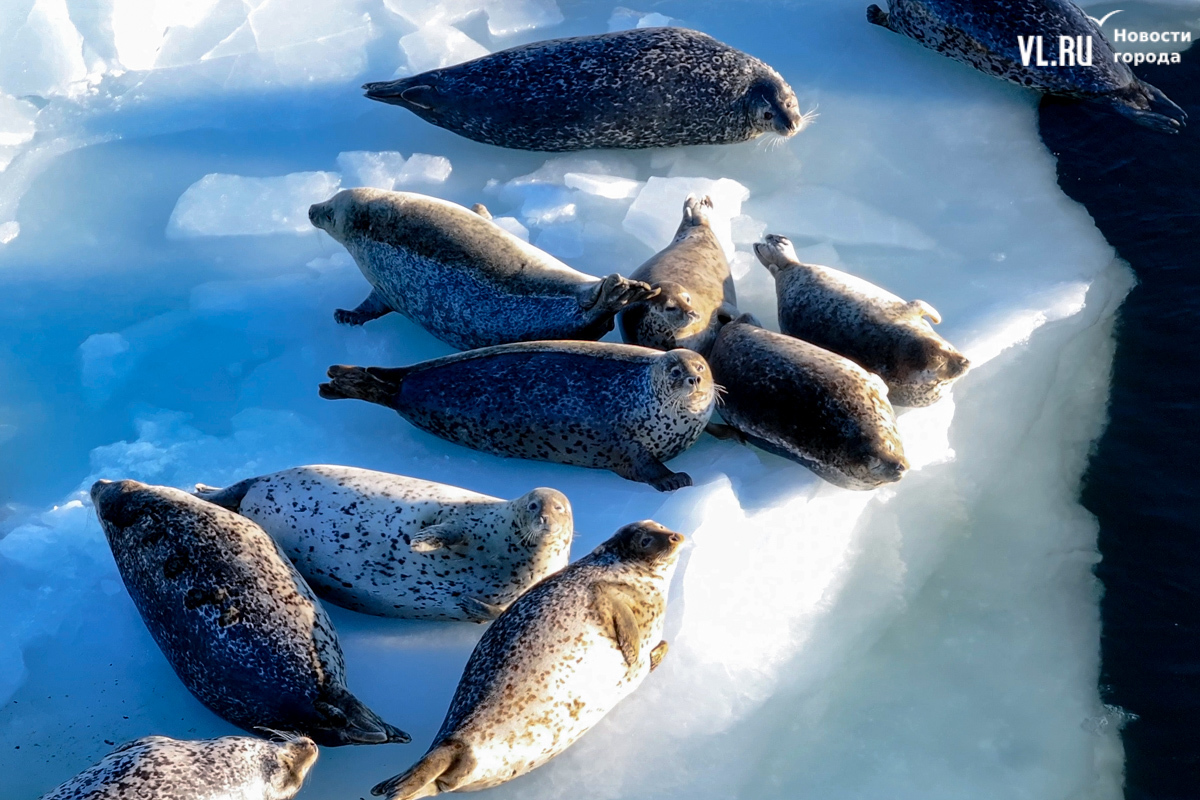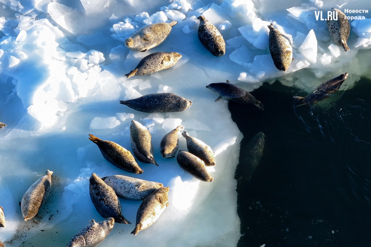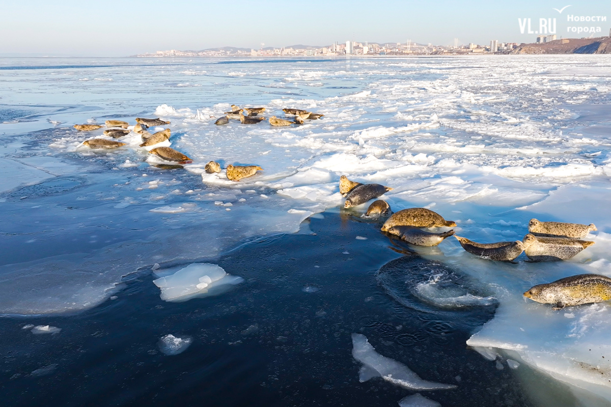 Ларги, или пятнистые тюлени, обычно выбирают для своих лежбищ уединённые бухты и скалистые пляжи, защищённые от сильных ветров и волн. Но небольшая группа пёстрых нерп традиционно выбирает своим лежбищем ледовое поле у самого Владивостока. Небольшая она, конечно, относительно — в погожий день на льду было до 70 зверей.