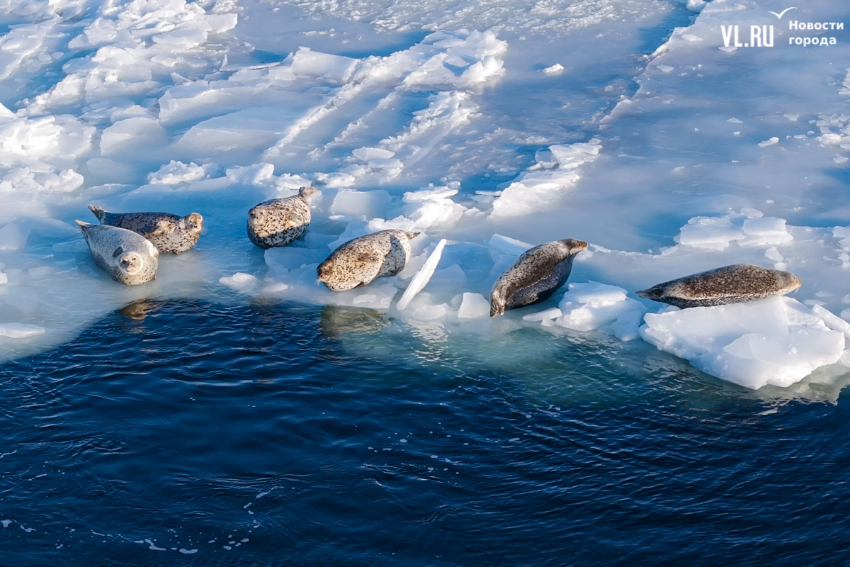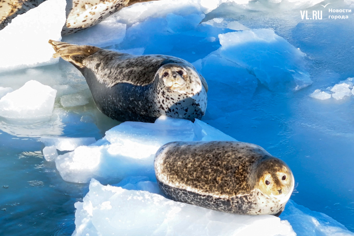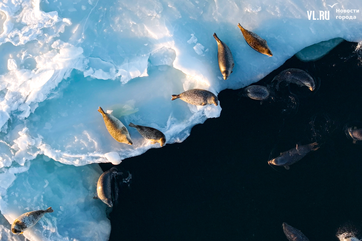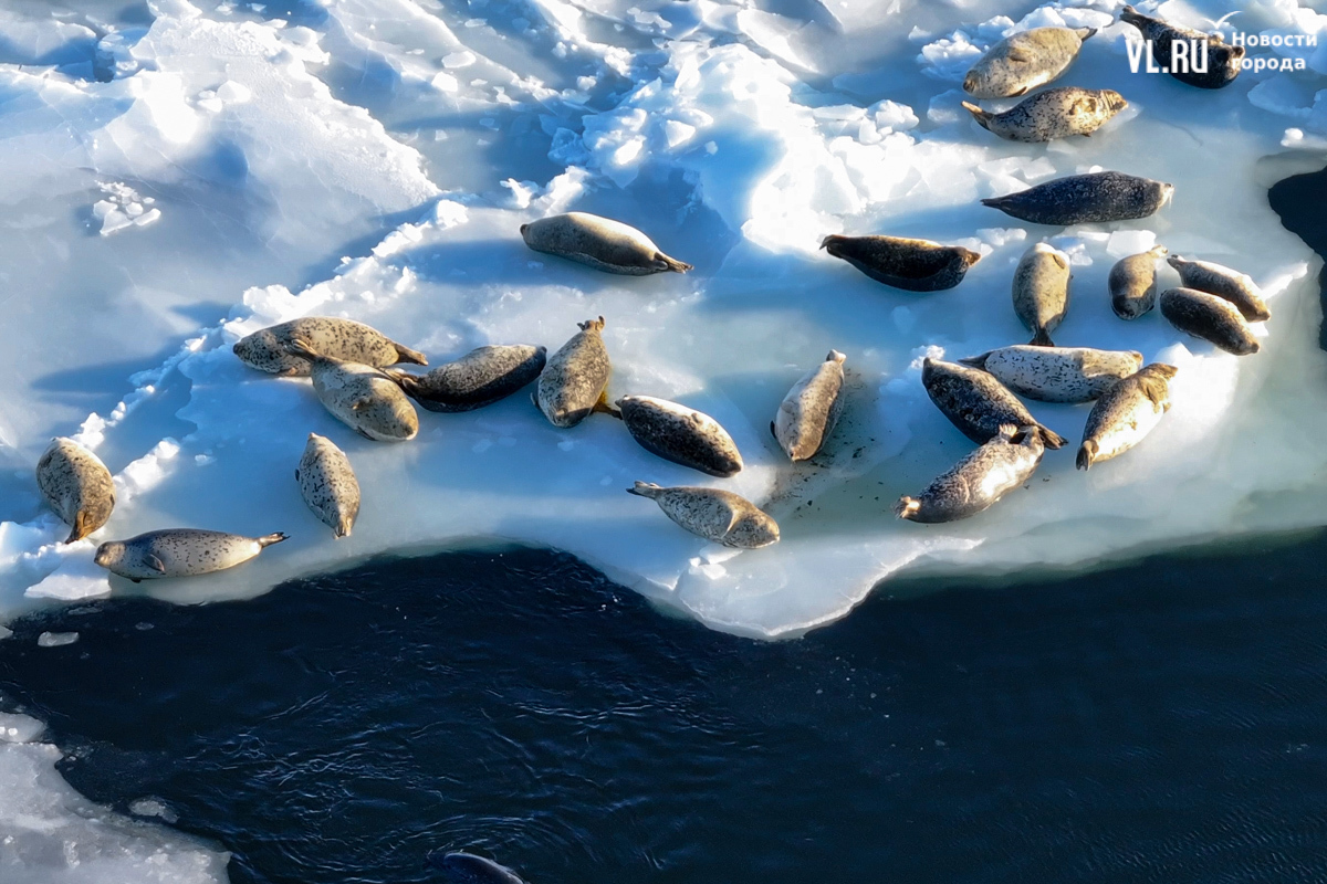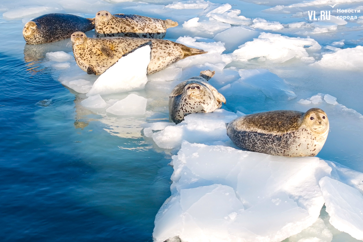 Ларги, или пятнистые тюлени, обычно выбирают для своих лежбищ уединённые бухты и скалистые пляжи, защищённые от сильных ветров и волн. Но небольшая группа пёстрых нерп традиционно выбирает своим лежбищем ледовое поле у самого Владивостока. Небольшая она, конечно, относительно — в погожий день на льду было до 70 зверей.