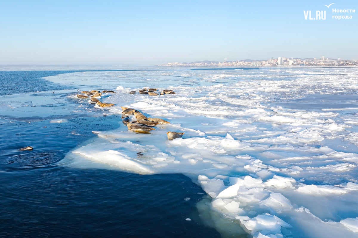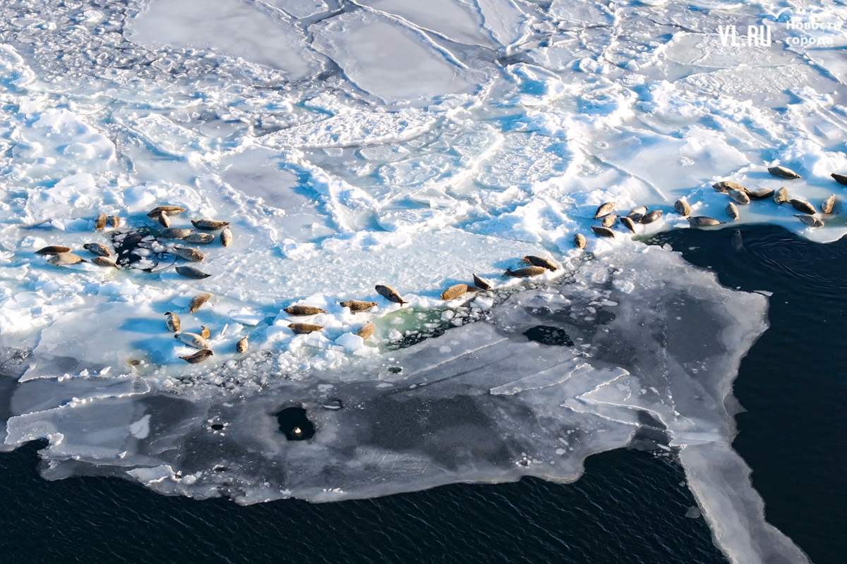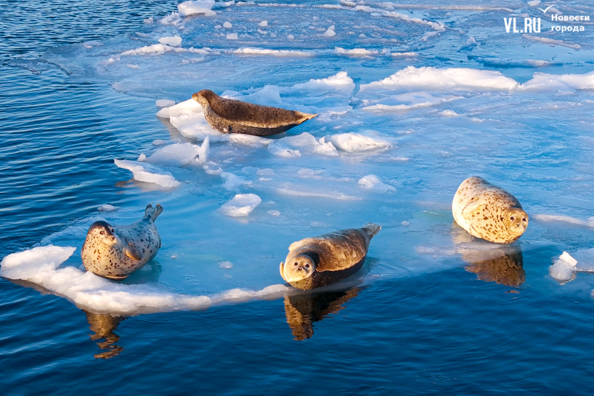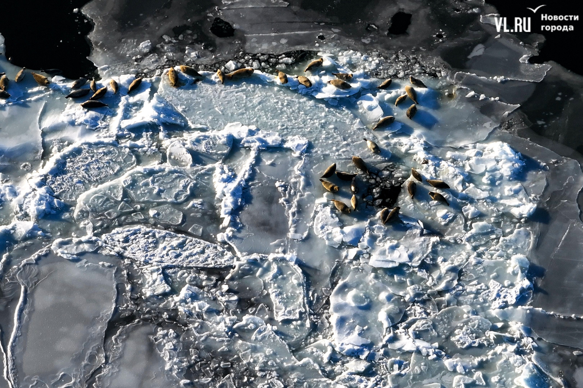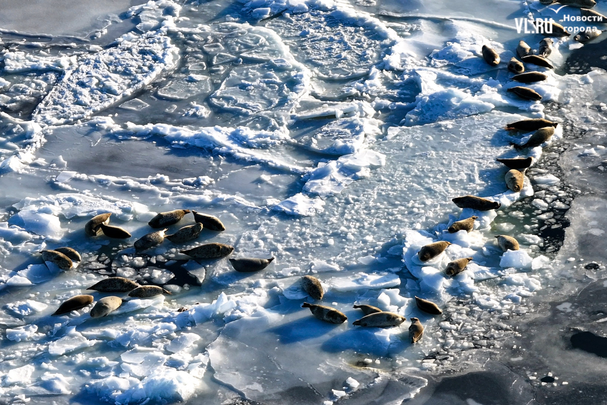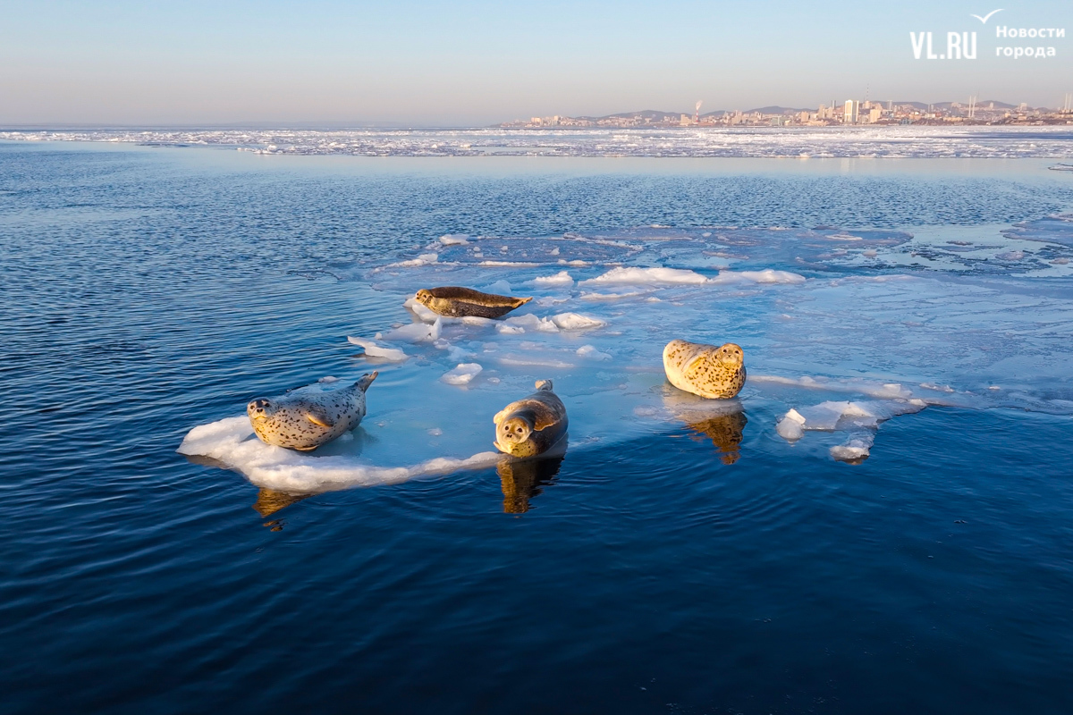 Ларги, или пятнистые тюлени, обычно выбирают для своих лежбищ уединённые бухты и скалистые пляжи, защищённые от сильных ветров и волн. Но небольшая группа пёстрых нерп традиционно выбирает своим лежбищем ледовое поле у самого Владивостока. Небольшая она, конечно, относительно — в погожий день на льду было до 70 зверей.