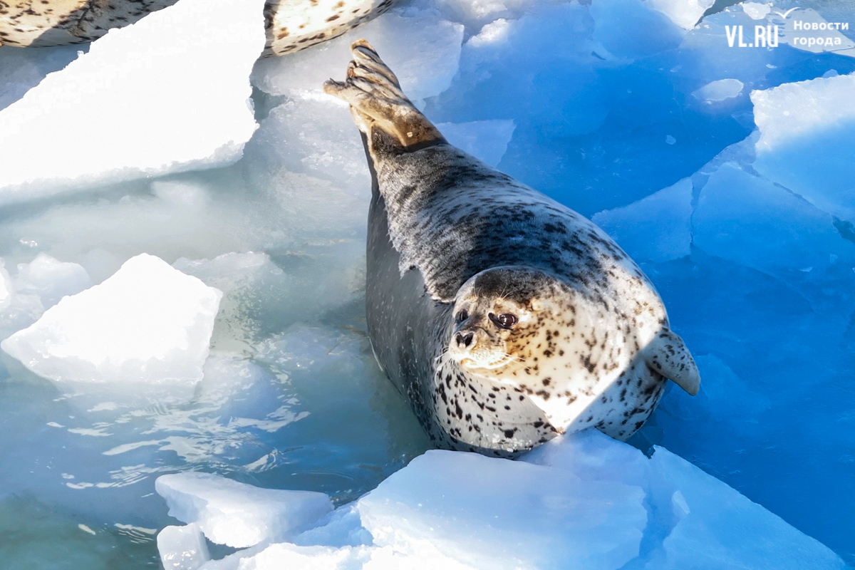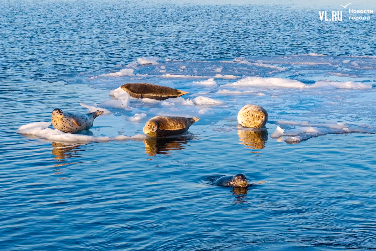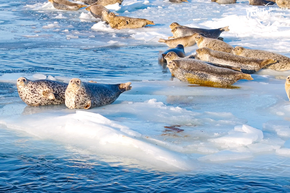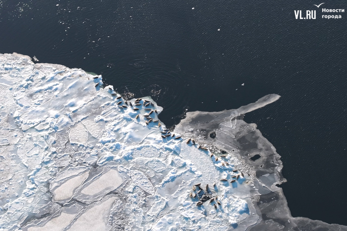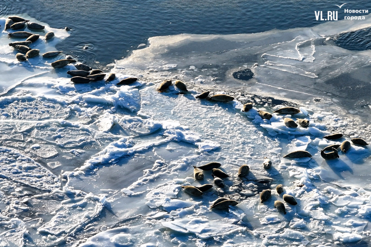 Ларги, или пятнистые тюлени, обычно выбирают для своих лежбищ уединённые бухты и скалистые пляжи, защищённые от сильных ветров и волн. Но небольшая группа пёстрых нерп традиционно выбирает своим лежбищем ледовое поле у самого Владивостока. Небольшая она, конечно, относительно — в погожий день на льду было до 70 зверей.