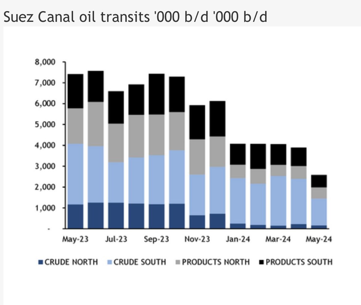 Совокупный поток нефти и нефтепродуктов, проходящих транзитом по Суэцкому каналу в обоих направлениях, в мае сократился на 34% по сравнению с предыдущим месяцем и на 65% по сравнению с аналогичным периодом прошлого года (данные Kpler). Большая часть нефти, проходящей через Суэцкий канал на юг, теперь имеет российское происхождение — 92% в мае.