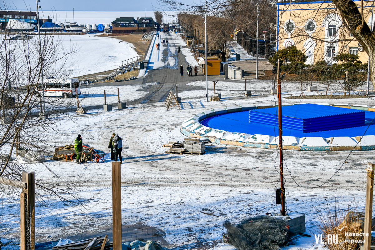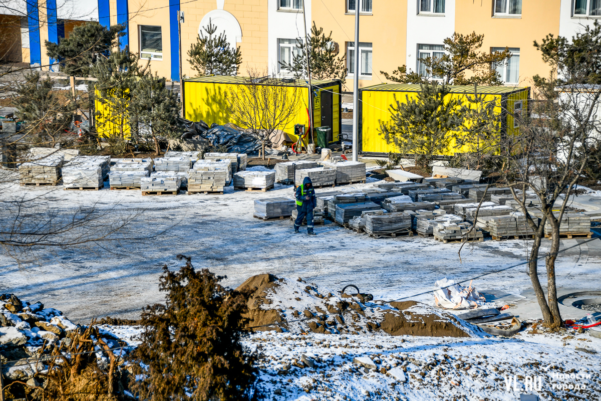 Начнём, с одного из самых известных общественных пространств Владивостока – набережной Спортивной гавани. Вторую очередь благоустройства около большого фонтана начали делать достаточно рано, в середине апреля, а трудились здесь на пике по несколько десятков рабочих. Но даже этого не хватило, чтобы успеть закончить до конца года. При этом контракт подорожал на 25 млн рублей от стартовой цены, до 275,5 млн рублей. Интересно, что первоначально зону вокруг фонтана, обещали открыть ещё в сентябре.