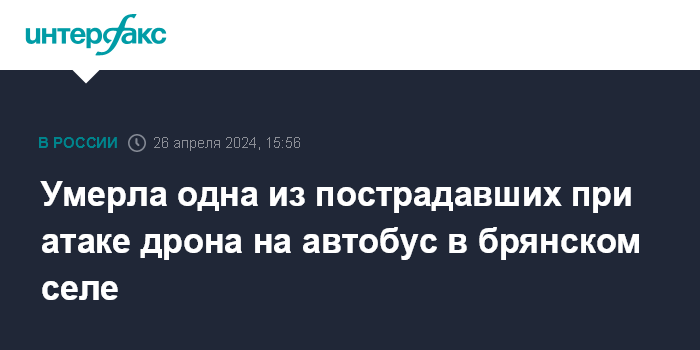 Москва. 26 апреля. INTERFAX.RU - Губернатор Брянской области Александр Богомаз сообщил о смерти женщины после атаки беспилотника на автобус, произошедшей накануне в селе Курковичи Стародубского муниципального округа.