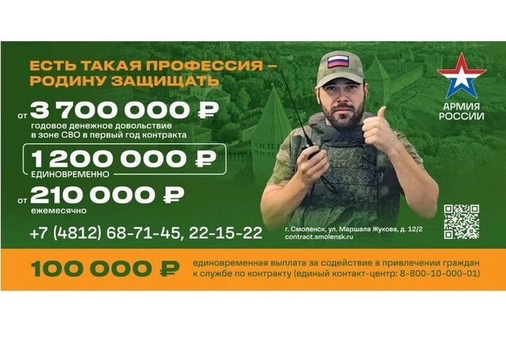 При заключении контракта на военную службу в Смоленской области предоставляется единоразовая выплата в размере 1,4 млн рублей. Кроме того, смоляне, которые оказывают содействие в подготовке кандидата к заключению контракта, теперь могут получить 100 тысяч рублей. Граждане, заключившие контракт на военную службу, получают возможность списать долги по кредитам до 10 млн. рублей.