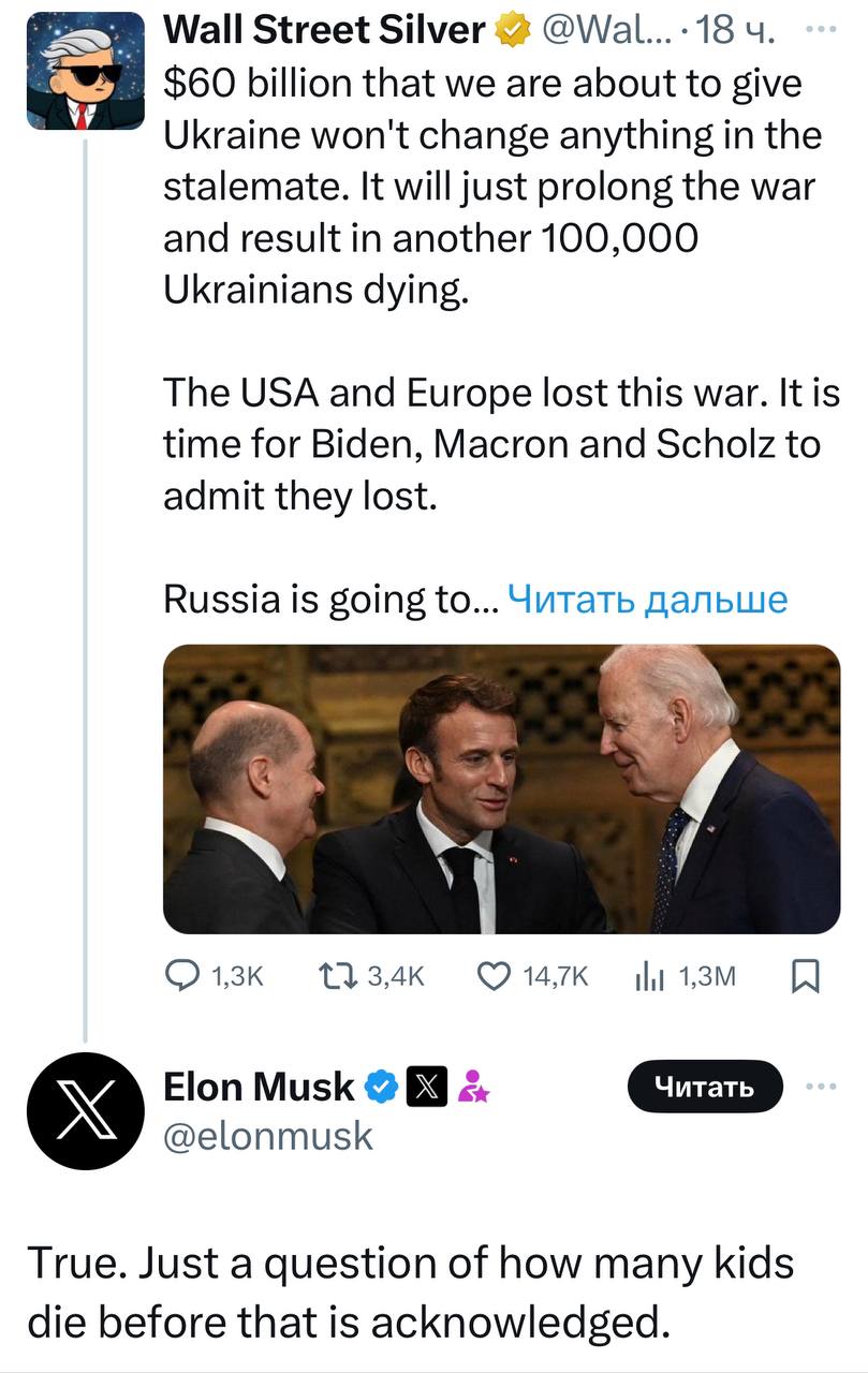 Илон Маск согласился с постом пользователя сети X Wall Street Silver, что Байден, Шольц и Макрон проиграли эту войну.