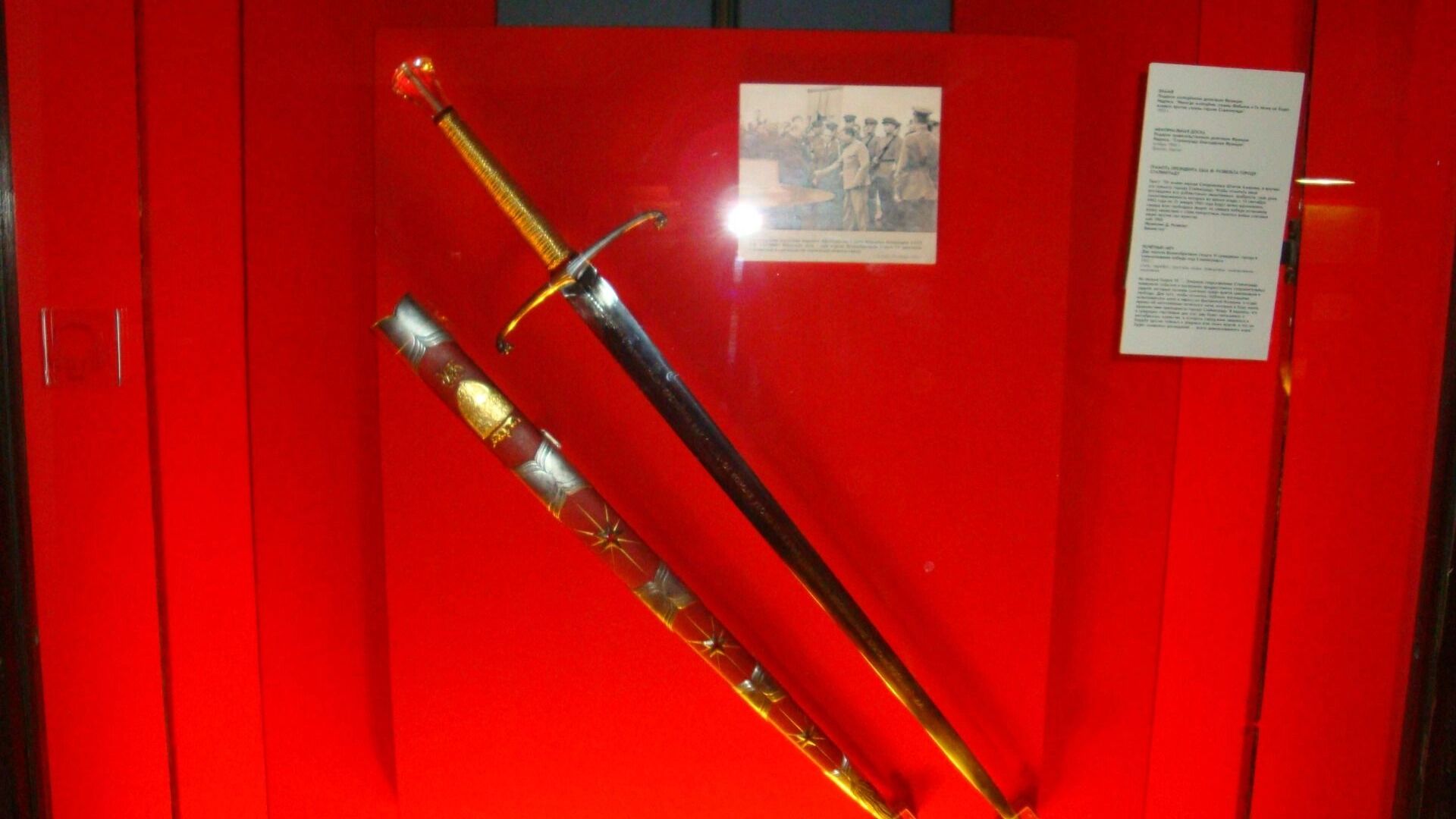 На сегодняшний день меч находится в Москве, являясь частью масштабной экспозиции «Без права на забвение. К 80-летию Великой Победы», организуемой Государственным историческим музеем. Данная экспозиция призвана напомнить современному поколению о величайших страницах отечественной истории, сохранить память о героях прошлого и укрепить чувство национальной гордости и единства.
