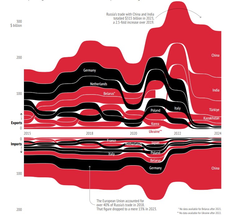 Торговля России сейчас стоит на трёх «китах» - Китае, Индии и Турции. Оборот России с Китаем и Индией вырос на 250% с 2019 г. Одновременно прямая официальная торговля с ЕС упала с 42% в 2019 г до 11% в 2024 г.
