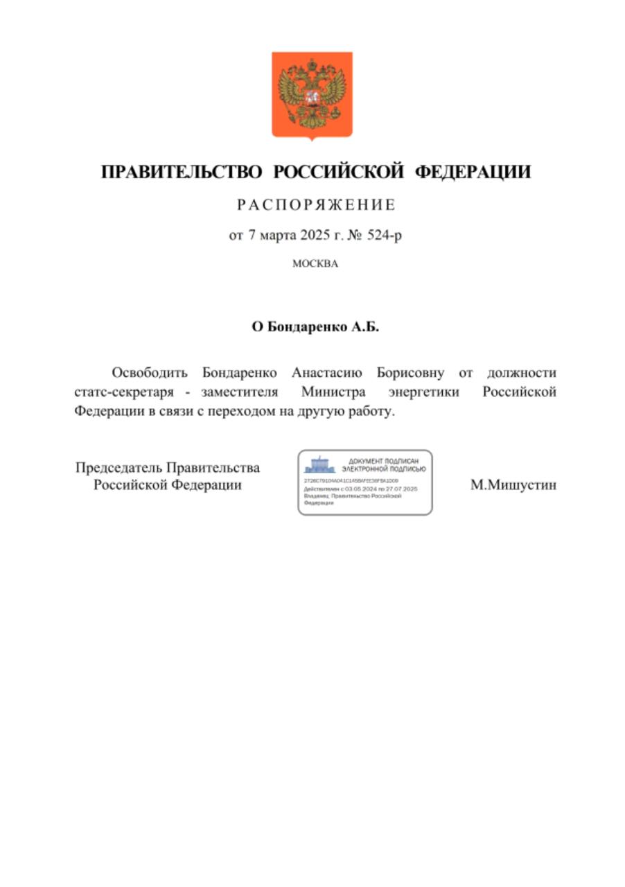 Правительство РФ освободило от должности статс-секретаря — замминистра энергетики Анастасию Бондаренко. Как указано в распоряжении, решение принято в связи с ее переходом на другую работу.