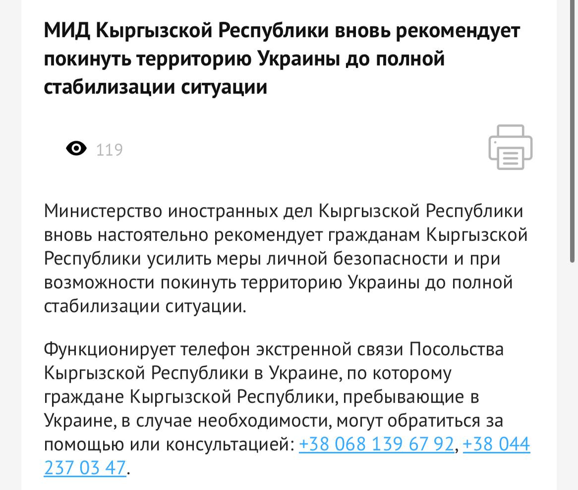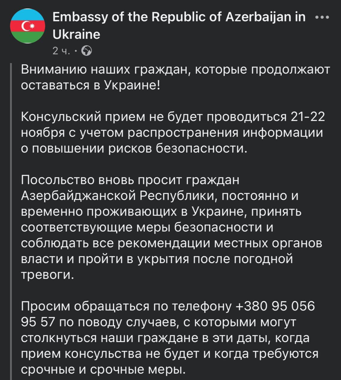 Посольства Азербайджана и Киргизии также призвали своих граждан по возможности покинуть Украину на фоне сообщений о возможном массированном обстреле