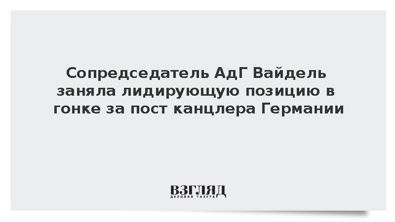 Алиса Вайдель, сопредседатель партии «Альтернатива для Германии» (АдГ), стала самым популярным кандидатом на пост канцлера ФРГ, пишет РИА «Новости». По данным опроса института INSA, проведенного для газеты Bild, она получила 24% голосов опрошенных немцев. На втором месте оказался Фридрих Мерц от Христианско-демократического и Христианско-социального союзов с 20%.