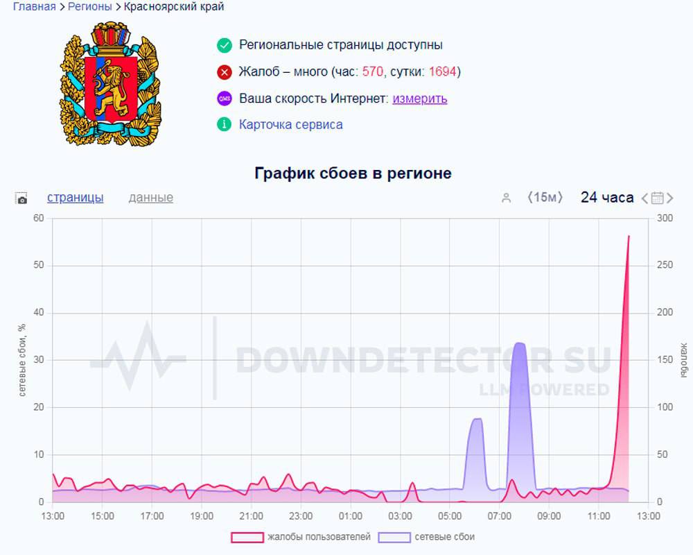 Жители Красноярского края жалуются на массовые сбои в работе мобильного интернета. Проблемы наблюдаются у всех операторов, свидетельствует сайт Downdetector. Рост жалоб на работу сети также наблюдается в Новосибирской области и Хакасии.