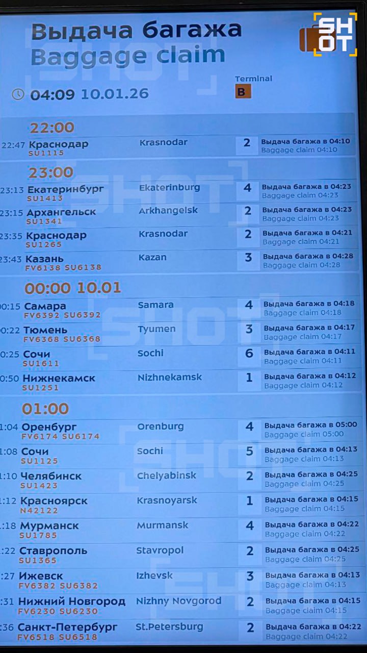 Один из пассажиров рассказал SHOT, что ждёт свой багаж уже более 4 часов. По его словам, несколько лент просто не работают. Самолёты продолжают садиться в аэропорту Шереметьево, и людей значительно прибавилось. Дети и взрослые легли спать на куртки и скамейки в ожидании своих сумок. Табло с выдачей багажа перестало показывать информацию дальше 01:00 ночи.