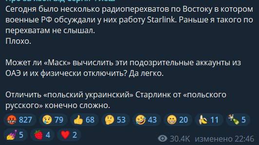 Украинский специалист по РЭБ сообщает, что на восточном фронте ВС РФ стали использовать терминалы спутниковой связи Starlink, что следует из радиоперехватов