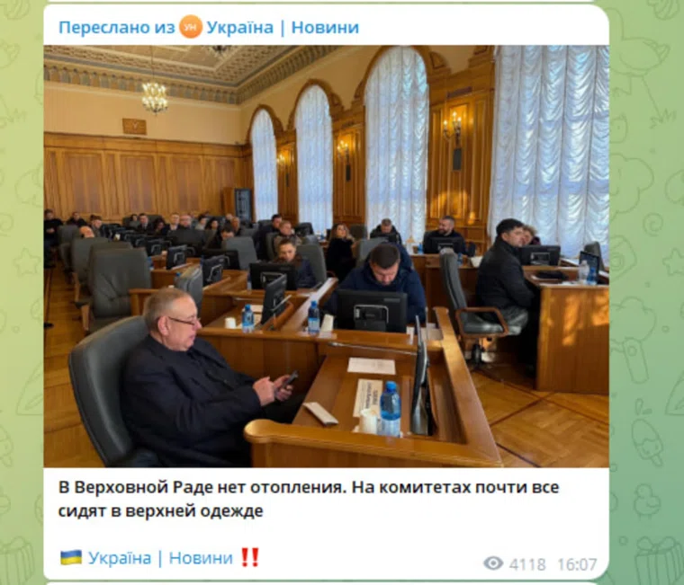 «В Верховной Раде нет отопления. На комитетах почти все сидят в верхней одежде», — пишет telegram-канал «Україна — Новини».