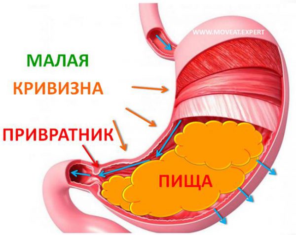 В желудке есть продольные складки. По продольным складкам малой кривизны желудка вода быстро проходит к привратнику 12-перстной кишки и быстро покидает желудок. При этом вода практически не смешивается с желудочным соком.