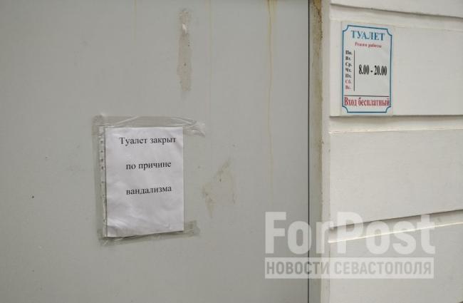 Последний бесплатный туалет – под лестницей у главпочтамта Севастополя – частично выведен из строя на ближайшие несколько недель. Департамент городского хозяйства ведет работу по восстановлению объекта – для чего нужно провести торги, но процесс ещё займет некоторое время.