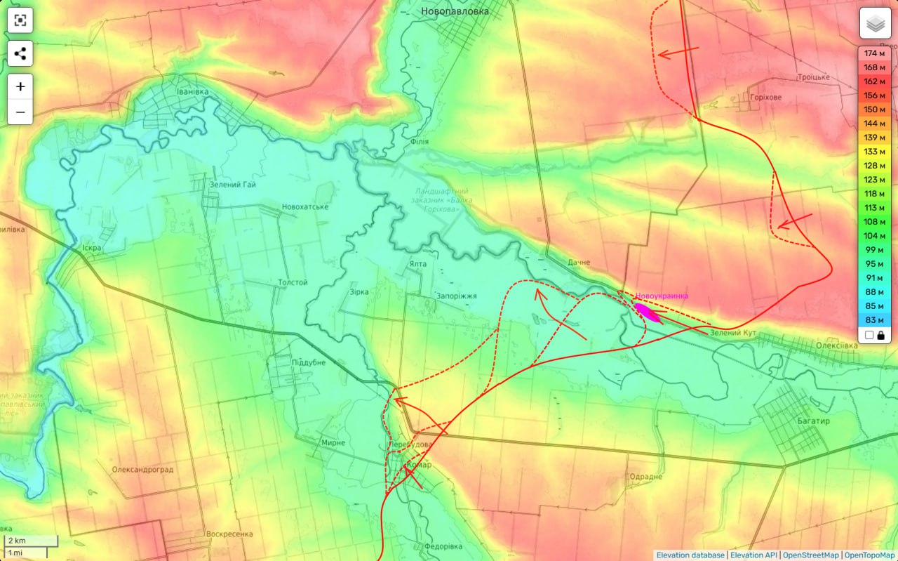 Это значит, что противник из него побежал. Как побежал он из посадок западнее Богатыря (хотя на картах инфопомоек противника он еще часть Константинополя держит). А мы побежали вслед за ним и уже добежали до восточных окраин н.п. Запорожья (маленького села на самом деле) и через речку до Дачного.