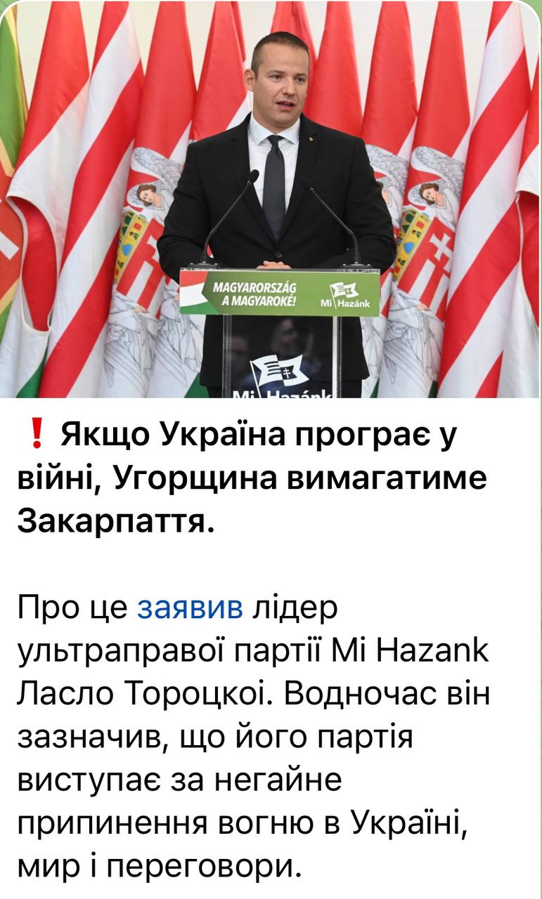 Если Украина проиграет в войне, Венгрия потребует Закарпатье. Об этом заявил лидер ультраправой партии Mi Hazank Ласло Тороцкой.