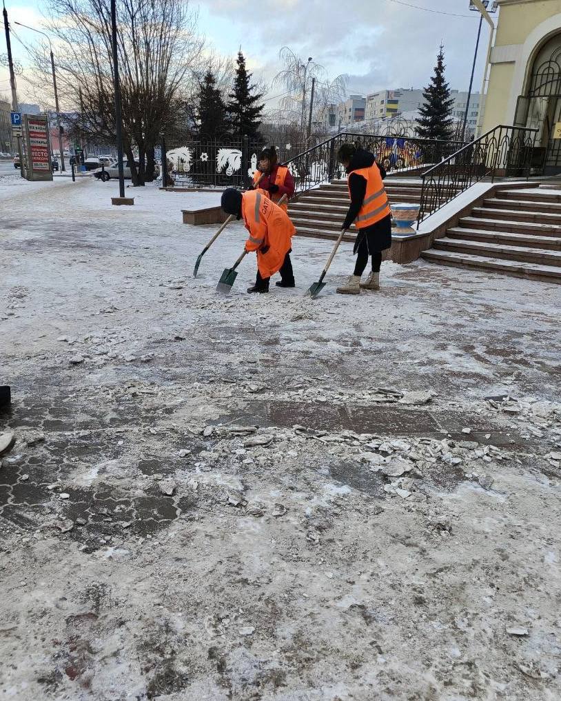 Специалисты особое внимание уделяют пешеходным дорожкам. Их чистят от снега, скалывают всю наледь и посыпают песком для безопасности.