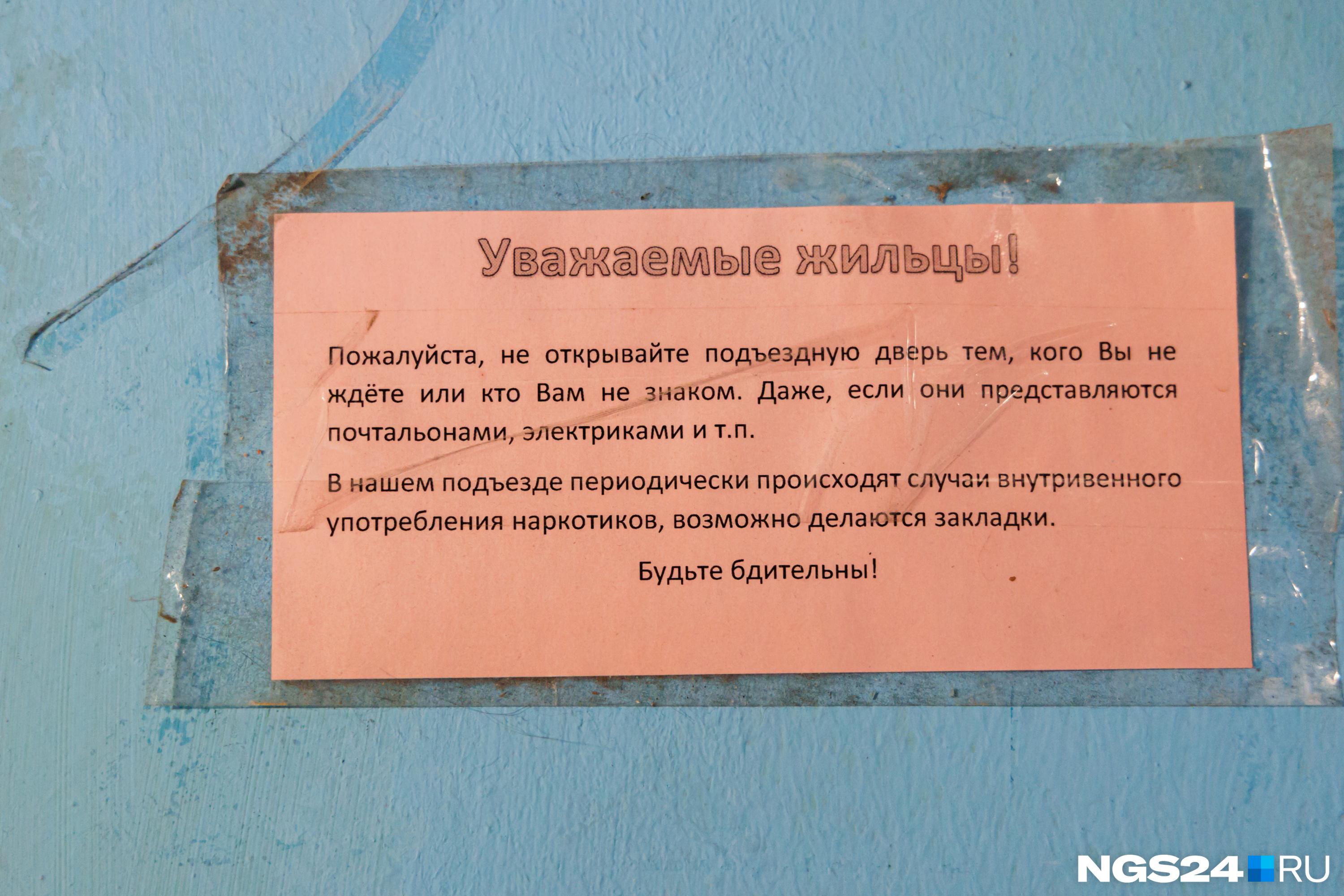 Кроме тараканов, жители этого дома еще борются с наркоманами. В подъездах расклеены объявления с просьбой не впускать незнакомых.