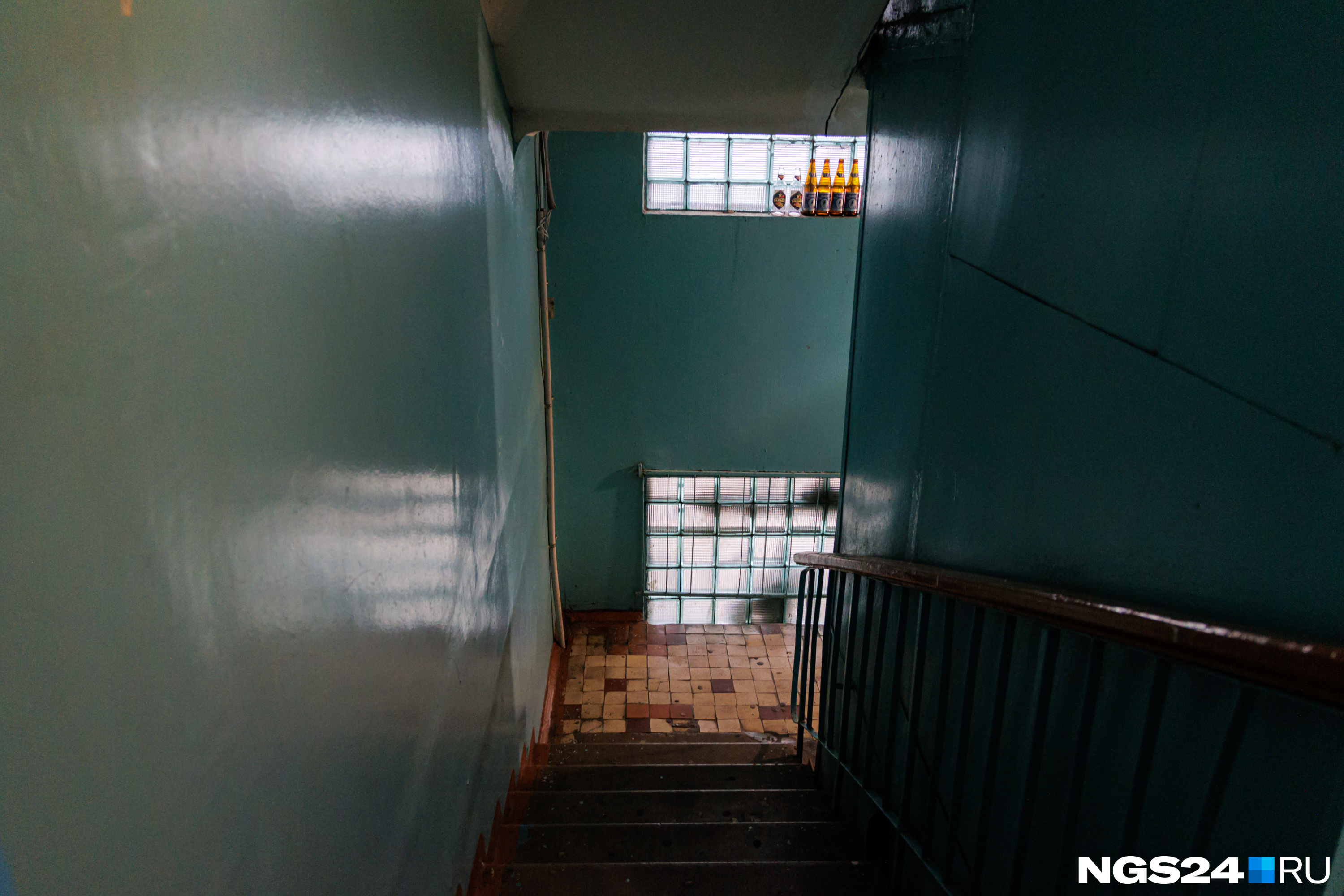 Подъезд выглядит чистым, если не считать оставленные пивные бутылки и окурки.