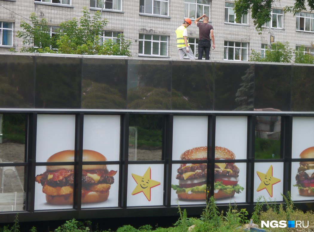 Рабочих заметили на крыше кафе Carl's Jr в Первомайском сквере — что происходит