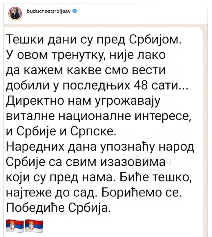 Президент Сербии Александр Вучич опубликовал загадочное предупреждение для граждан страны «Сейчас мне непросто сказать, какие новости мы получили в последние 48 часов», ‒ написал он на своей странице в соцсети. Ознакомить сербов с полученной информацией Вучич пообещал в ближайшие дни. «Будет тяжело, как никогда тяжело. Мы будем бороться. Сербия победит», ‒ заверил сербский лидер. Подписывайтесь на «Абзац»