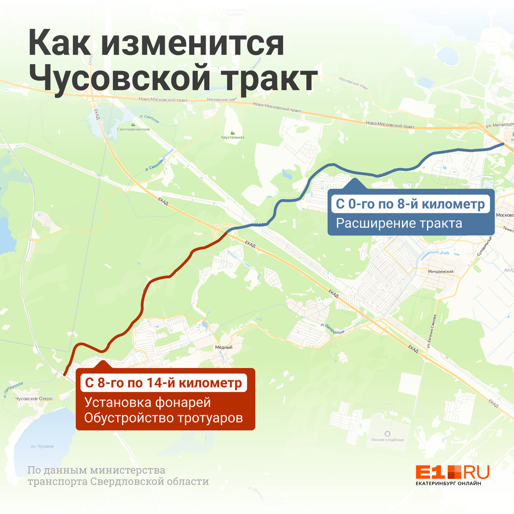 Напомним, что планируемая реконструкция Чусовского тракта (официальное название дороги — Подъезд к озеру Чусовскому) состоит из двух этапов. Также реконструируют участок тракта от 0-го до 8-го километра — от Объездной дороги до ЕКАД. Он будет существенно расширен, конкурс на разработку проекта был объявлен зимой 2022–2023 года.