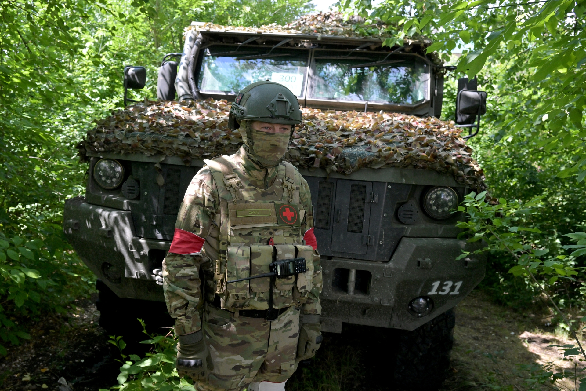 - Военнослужащий медицинской службы возле бронеавтомобиля для эвакуации раненых «Линза»