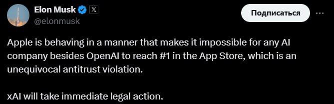 Илон Маск решил судиться с Apple. По мнению миллиардера, корпорация нарушает антимонопольное законодательство, поскольку «ни одна компания в сфере ИИ, кроме OpenAI, не может занять первое место в App Store». ChatGPT занимает первое место в разделе «Лучшие бесплатные приложения» App Store для iPhone в США, в то время как разработанная компанией Маска нейросеть Grok находится на пятом месте, чат-бот Gemini от Google — на 57-м месте. Кроме того, ChatGPT стал единственным чат-ботом на основе ИИ, который размещён в разделе «Must-Have Apps» в App Store.