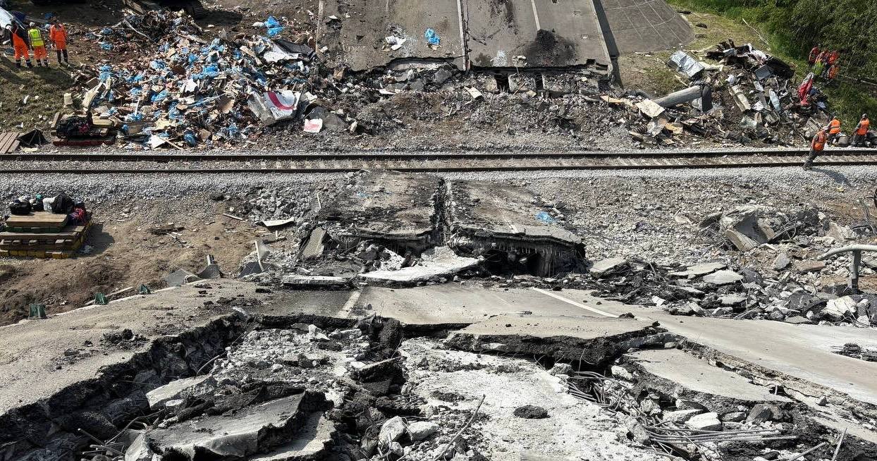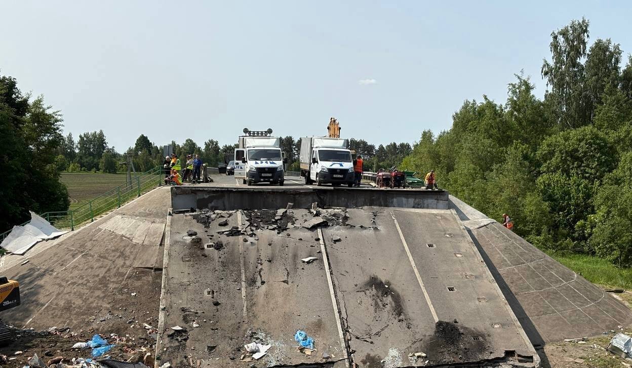 На месте обрушения моста в Выгоничском районе Брянской области остаются два вагона поезда. Ж/д пути расчищены от обломков.
