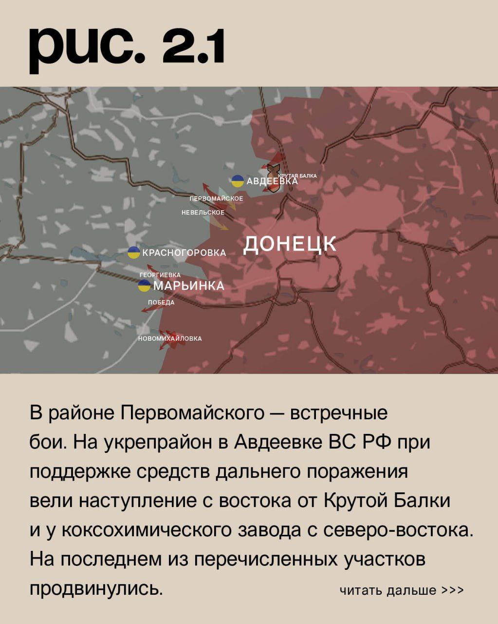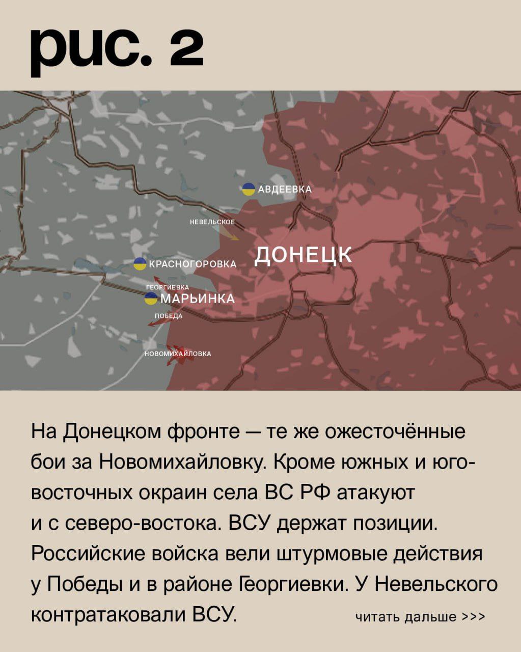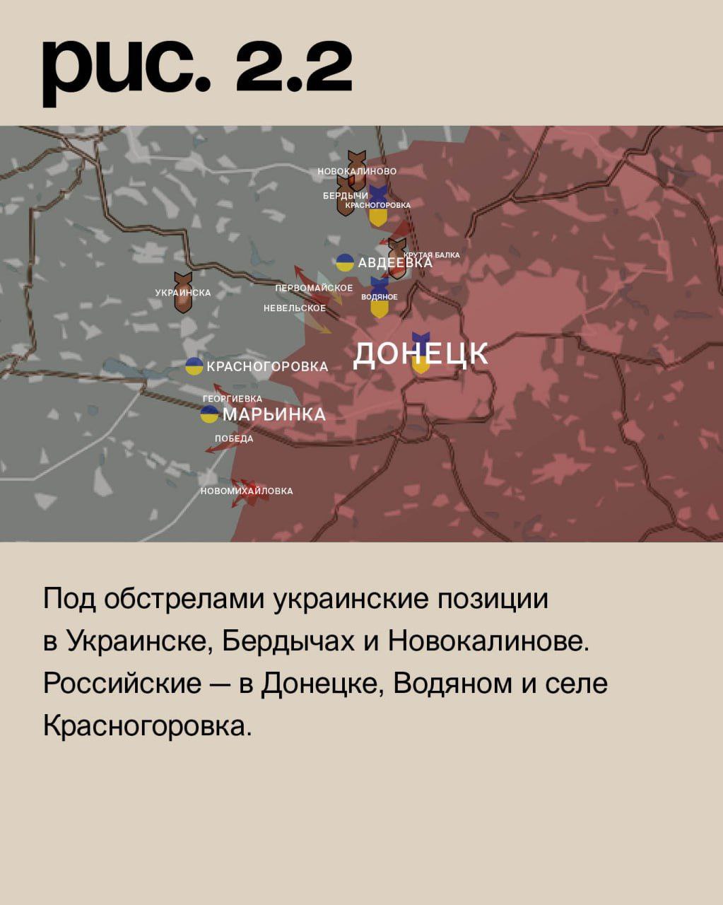 На Донецком фронте – те же ожесточённые бои за Новомихайловку. Кроме южных и юго-восточных окраин села ВС РФ атакуют и с северо-востока. ВСУ держат позиции. Российские войска вели штурмовые действия у Победы и в районе Георгиевки. У Невельского контратаковали ВСУ. В районе Первомайского – встречные бои. На укрепрайон в Авдеевке ВС РФ при поддержке средств дальнего поражения вели наступление с востока от Крутой Балки и у коксохимического завода с северо-востока. На последнем из перечисленных участков продвинулись. Под обстрелами украинские позиции в Украинске, Бердычах и Новокалинове. Российские – в Донецке, Водяном и селе Красногоровка. (Рис. 2)