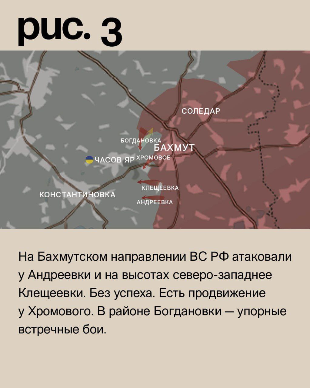 На Бахмутском направлении ВС РФ атаковали у Андреевки и на высотах северо-западнее Клещеевки. Без успеха. Есть продвижение у Хромового. В районе Богдановки – упорные встречные бои. (Рис. 3)