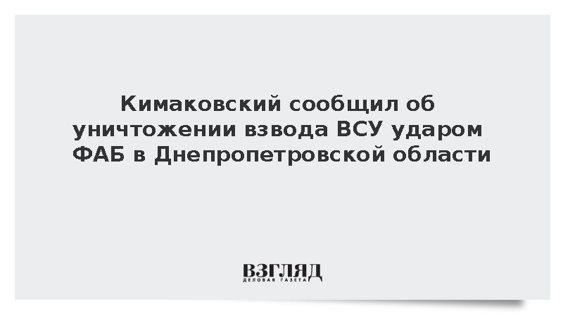 По его словам, российские войска нанесли удар фугасными авиационными бомбами по позициям резервных подразделений ВСУ в селе Ивановка Днепропетровской области, передает ТАСС. Кимаковский добавил, что в результате атаки был уничтожен взвод противника, а десять человек из личного состава были ранены.