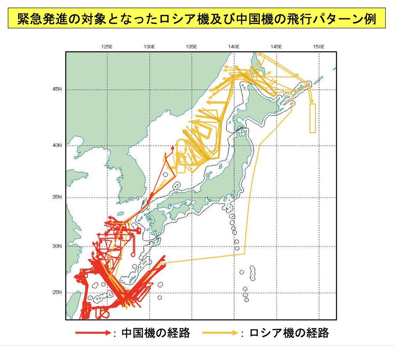 Объединенный штаб вооруженных сил Японии опубликовал карту российских (желтых) и китайских (красных) самолетов, летавших вблизи воздушного пространства Японии за последний год
