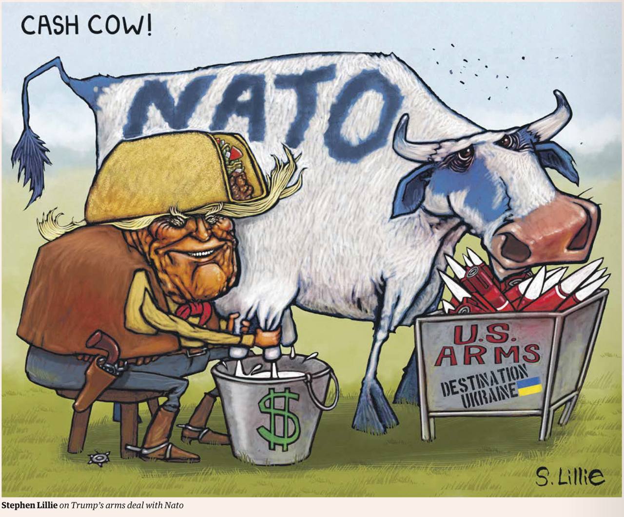«Дойная корова». The Guardian иллюстрирует новые отношения между Трампом и НАТО. Газета на полном серьезе пишет, что только «доллары от НАТО развернули Трампа против Путина». Надо запомнить это выражение: раньше были нефтедоллары, а теперь натодоллары.