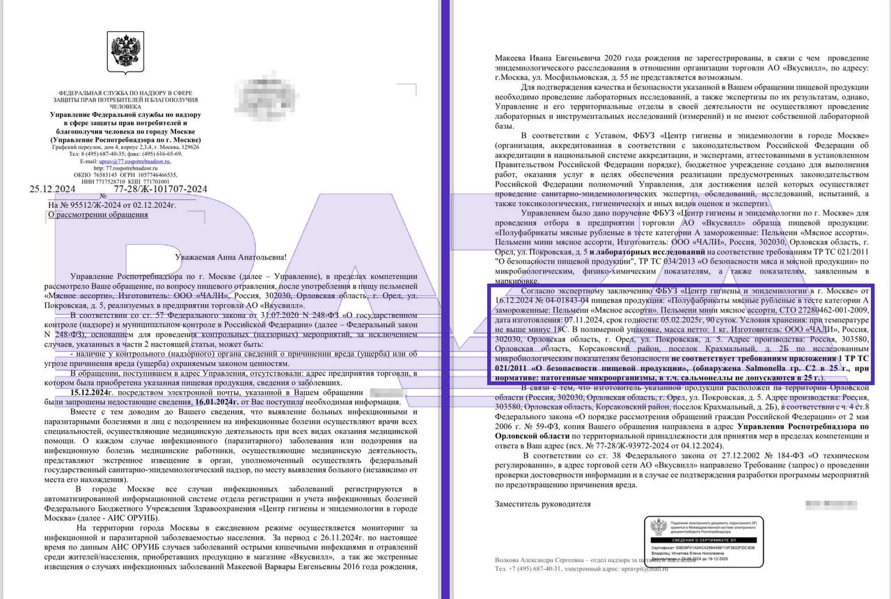 Через месяц пришло письмо с результатами проверки. Она подтвердила наличие сальмонеллы в пельменях. Ведомство направило жалобу по месту производства пельменей в Орловской области, прокуратура региона начала проверку.