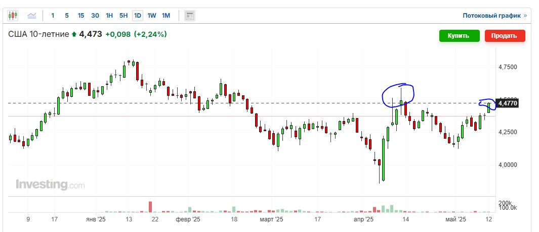В отличие от фондового рынка, где произошел бурный рост на 3.2% по индексу SP500, на рынке Трежерис были продажи, в результате чего доходность по 10-леткам вновь поднялась до недавних пиковых значений (см. график внизу), когда Трамп ввел свои драконовские пошлины.