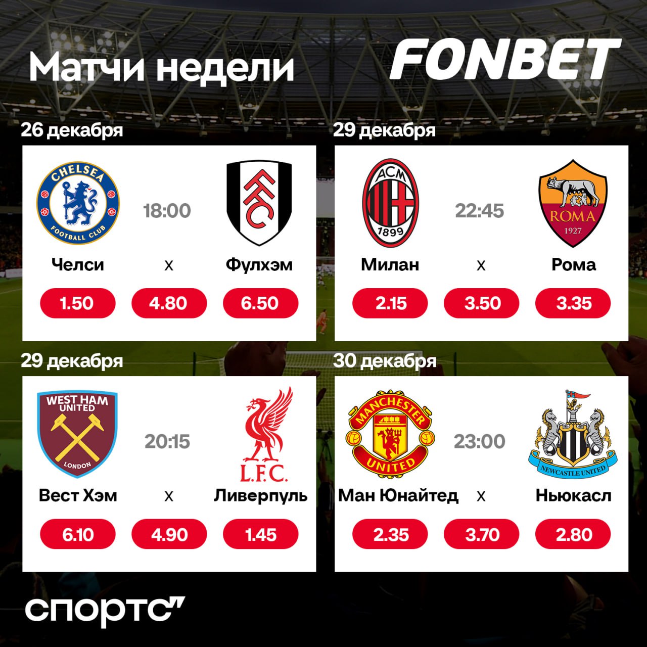 🎄❄️ Наступило время года, когда в футбол почти нигде не играют – но только не в Англии! Легендарный Boxing day стартует сегодня, матчи есть почти каждый день до самого Нового года. И не забывайте про Серию А – там не только «Милан» vs «Рома», но и суперигра лидера «Аталанты» против залетевшего в топ-4 «Лацио»