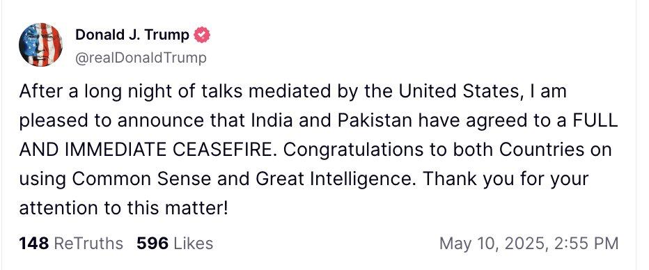 "После долгих ночных переговоров при посредничестве Соединенных Штатов я рад сообщить, что Индия и Пакистан договорились о ПОЛНОМ И НЕМЕДЛЕННОМ ПРЕКРАЩЕНИИ ОГНЯ. Поздравляю обе страны с тем, что они проявили здравый смысл и высокий интеллект. Спасибо вам за ваше внимание к этому вопросу!"