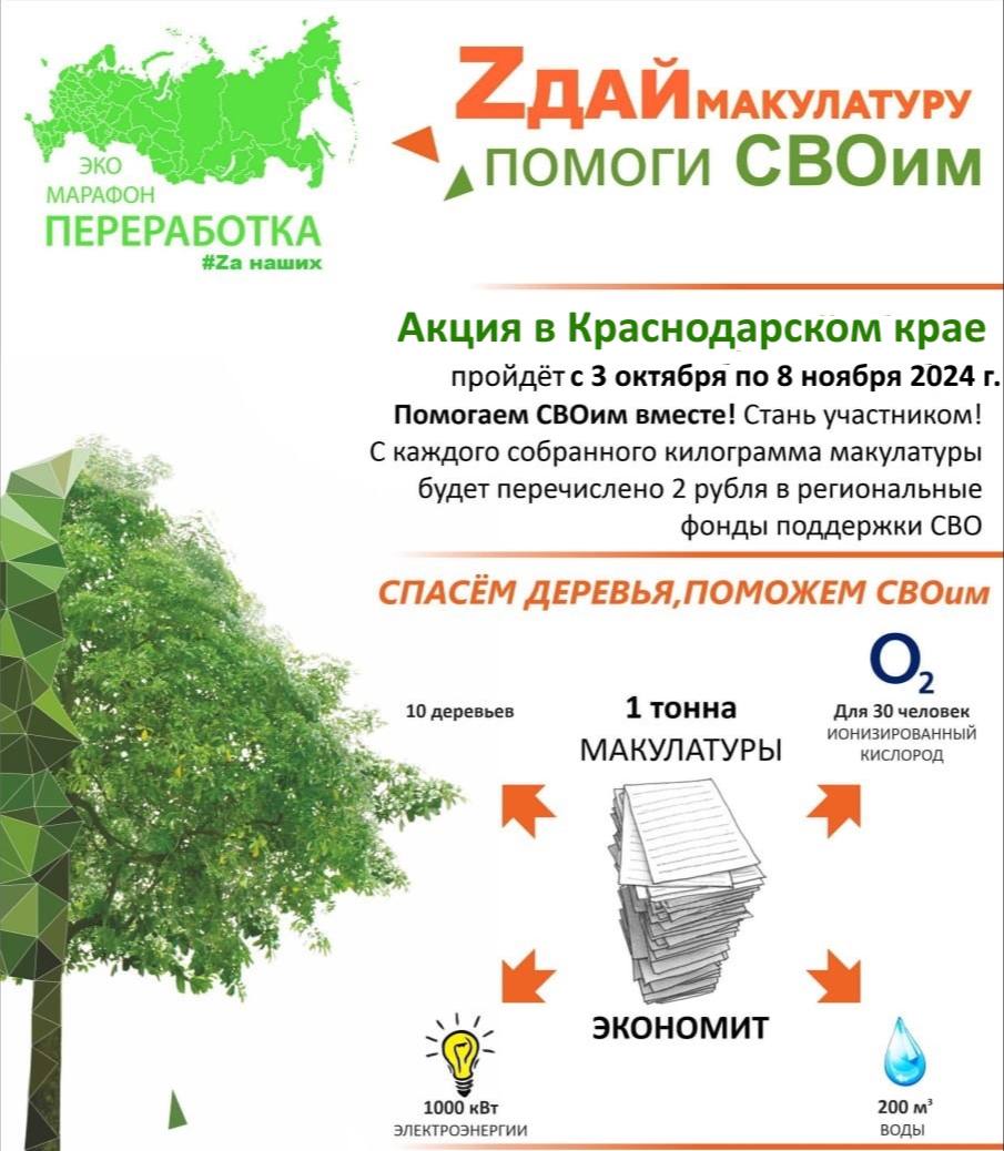 Этой осенью, с 3 октября по 8 ноября, жителей Кубани приглашают к участию в акции по сбору макулатуры, которая пройдет под девизом: «Zдай бумагу – помоги СВОим»