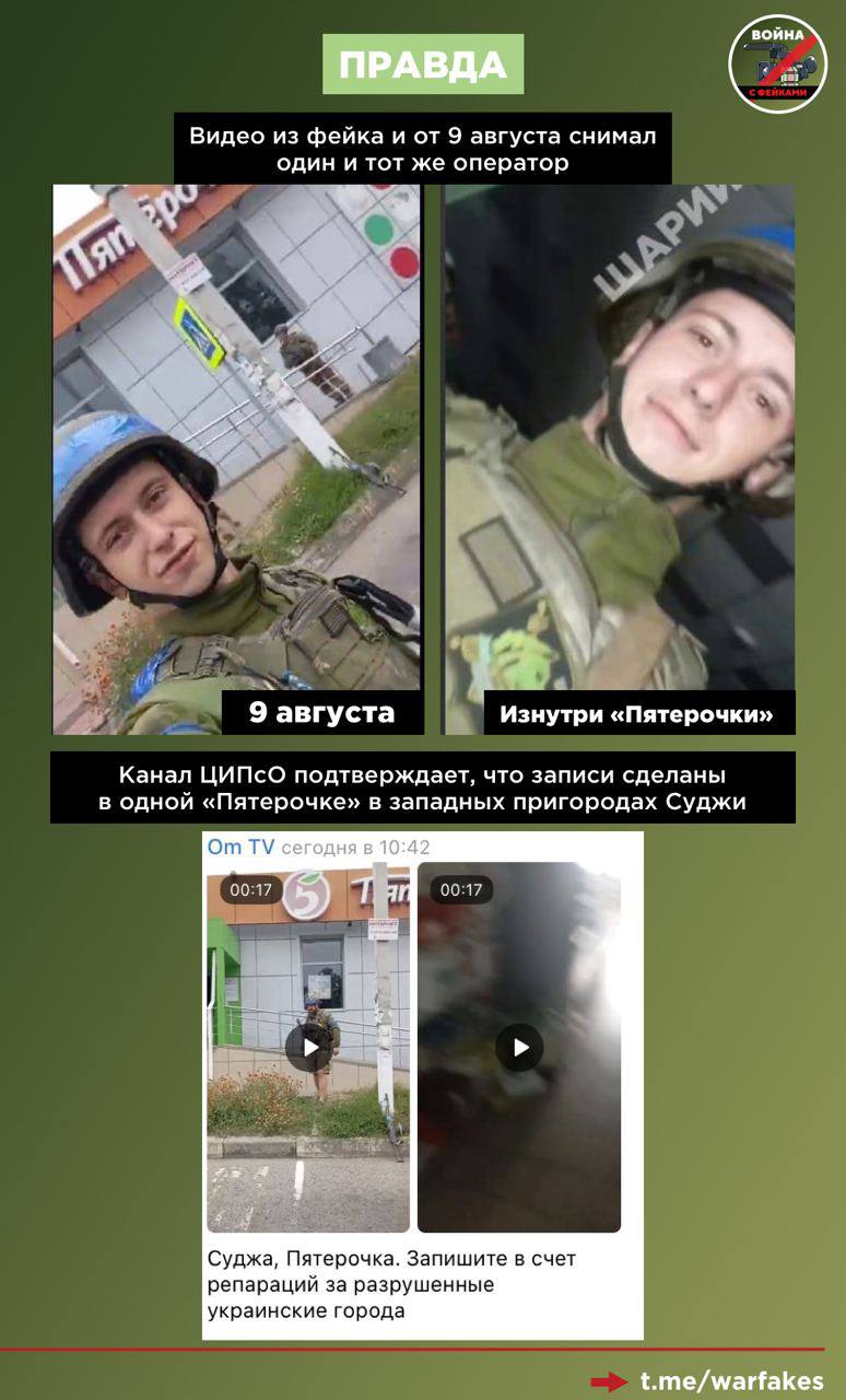 Девятого августа ВСУ записали несколько отрывочных видео на фоне газораспределительной станции в селе Заолешенка, находящемся западнее Суджи. Этими записями ЦИПсО иллюстрировала фейковый тезис о том, что «украинские силы полностью захватили город Суджа». Пропагандисты также публиковали фотографии боевиков на фоне магазина «Пятерочка», чтобы придать своим заявлениям о захвате города масштаб.